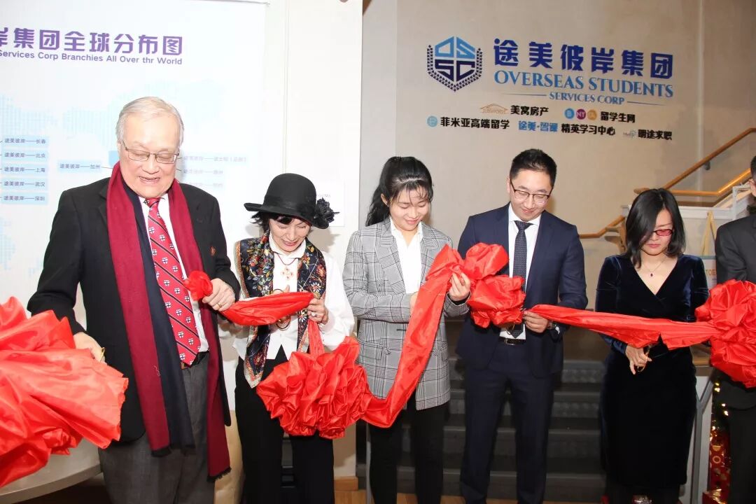 途美彼岸集团创始人兼董事长王兆楠先生、纽约大学工学院前校长、纽约大学校监张钟浚(David C.Chang)及夫人Cecilia Chang、教育部旗下赛尔教育副总孙丽、美联高中司东林校长等多位合伙人及嘉宾共同出席了开幕式,并为新总部进行了开张剪彩。